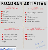 Jujur beberapa hari ini sejak menyelesaikan pratantangan aku mencoba membenahi manajemen waktu hingga hari terakhir pengumpulan tugas 🤭 karena masih mengaplikasikan dan mereview. Serta trial and error mengenai kandang waktu dan kuadran aktivitas yang sudah kubuat.